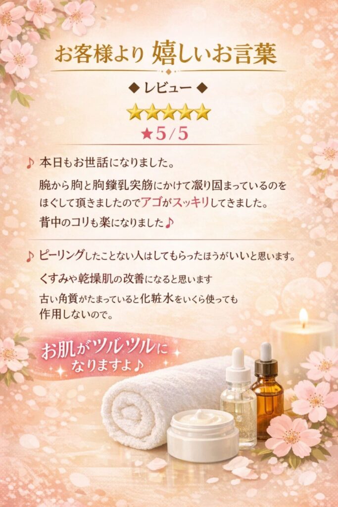 もちろん、施術後は、バキバキだった身体がスムーズに動くようになり、身体だけでなく気持ちまですっきりです。